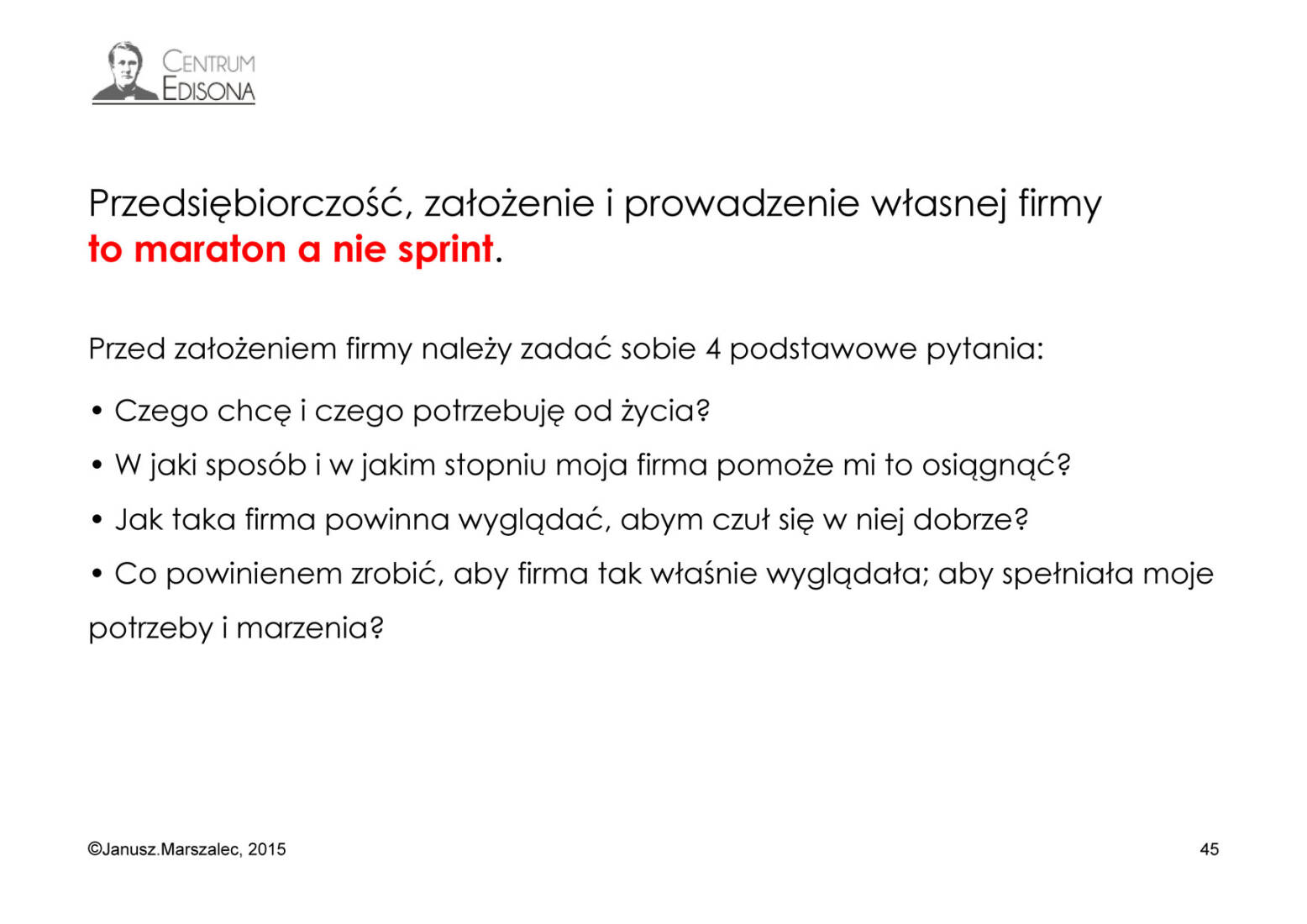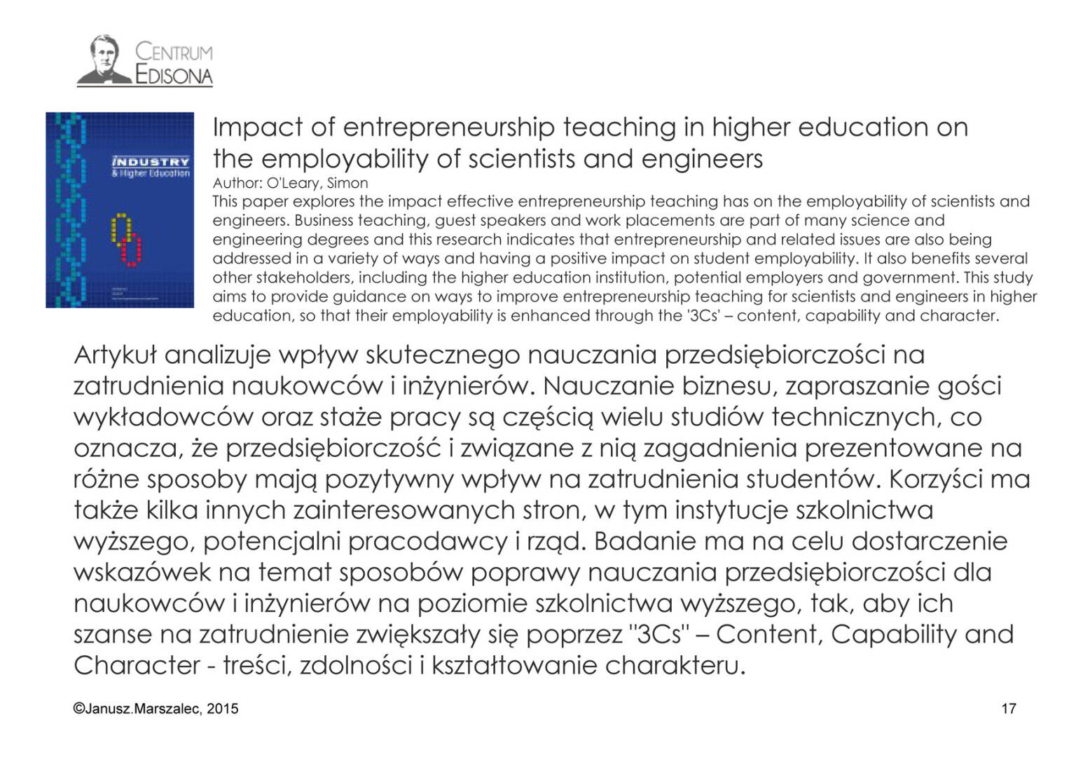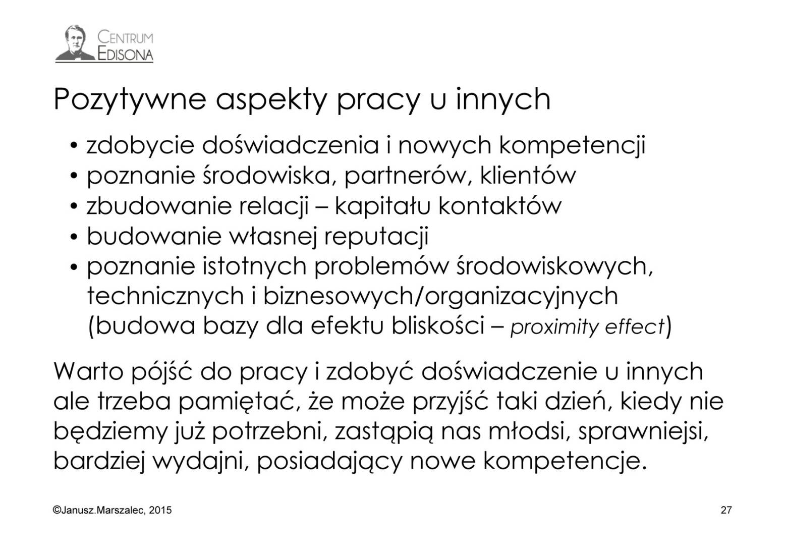 W ramach wykładu przedstawione zostały zagadnienia znaczenia możliwie najbardziej świadomego wyboru drogi zawodowej po studiach technicznych, nauczania przedsiębiorczości i znaczenia tego przedmiotu na studiach niebiznesowych na świecie, zagadnienia związane z podjęciem decyzji o pracy dla innych lub pracy dla siebie.