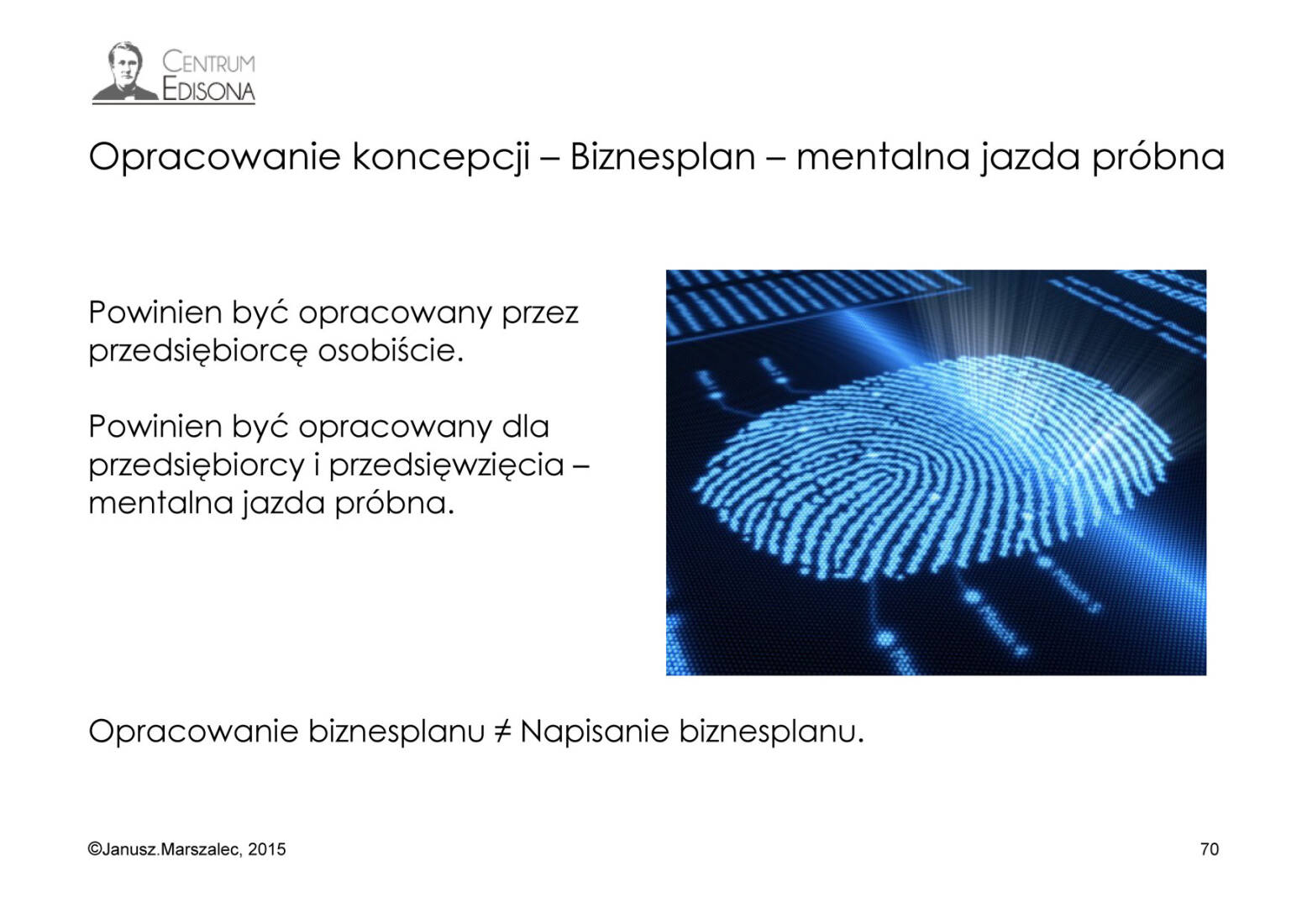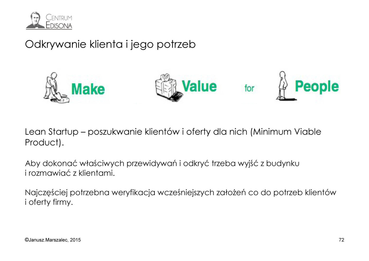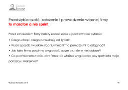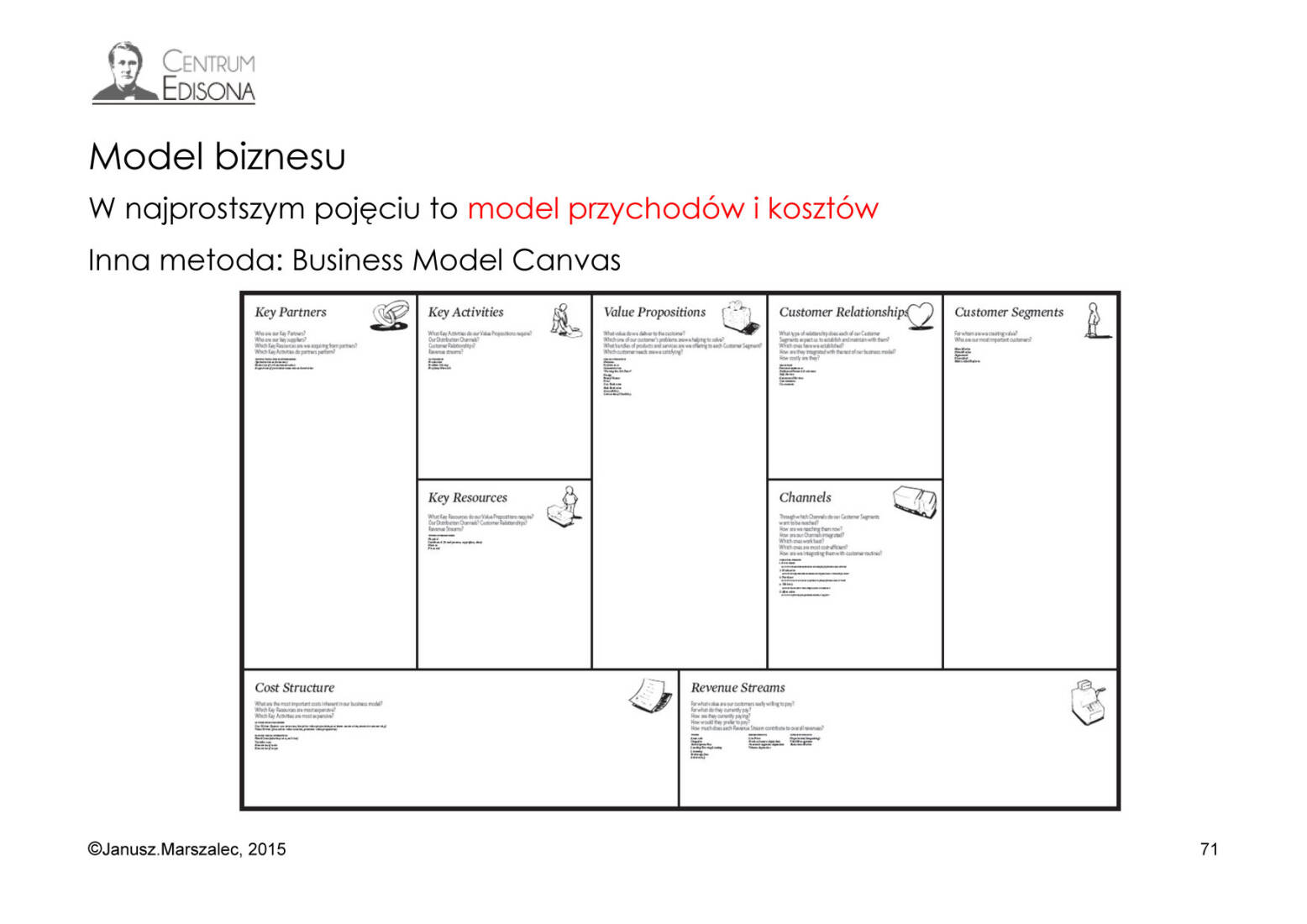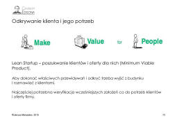 Omówiono metodykę budowy modelu biznesowego własnego przedsiębiorstwa, zwracając szczególną uwagę na fakt, że startup znacząco różni się od istniejącej już i działającej firmy i na to, jak odpowiednie zachowania na etapie budowy własnego biznesu wpływają na sukces.